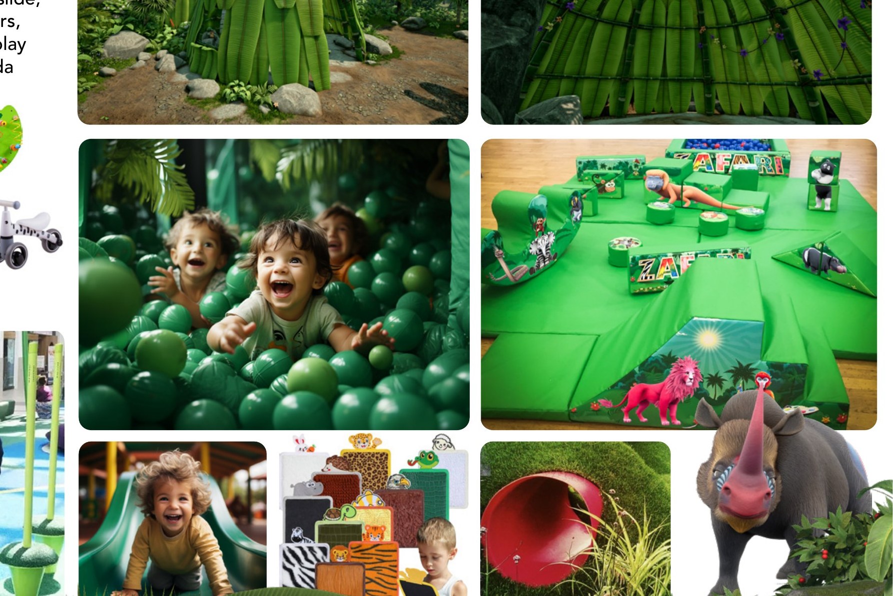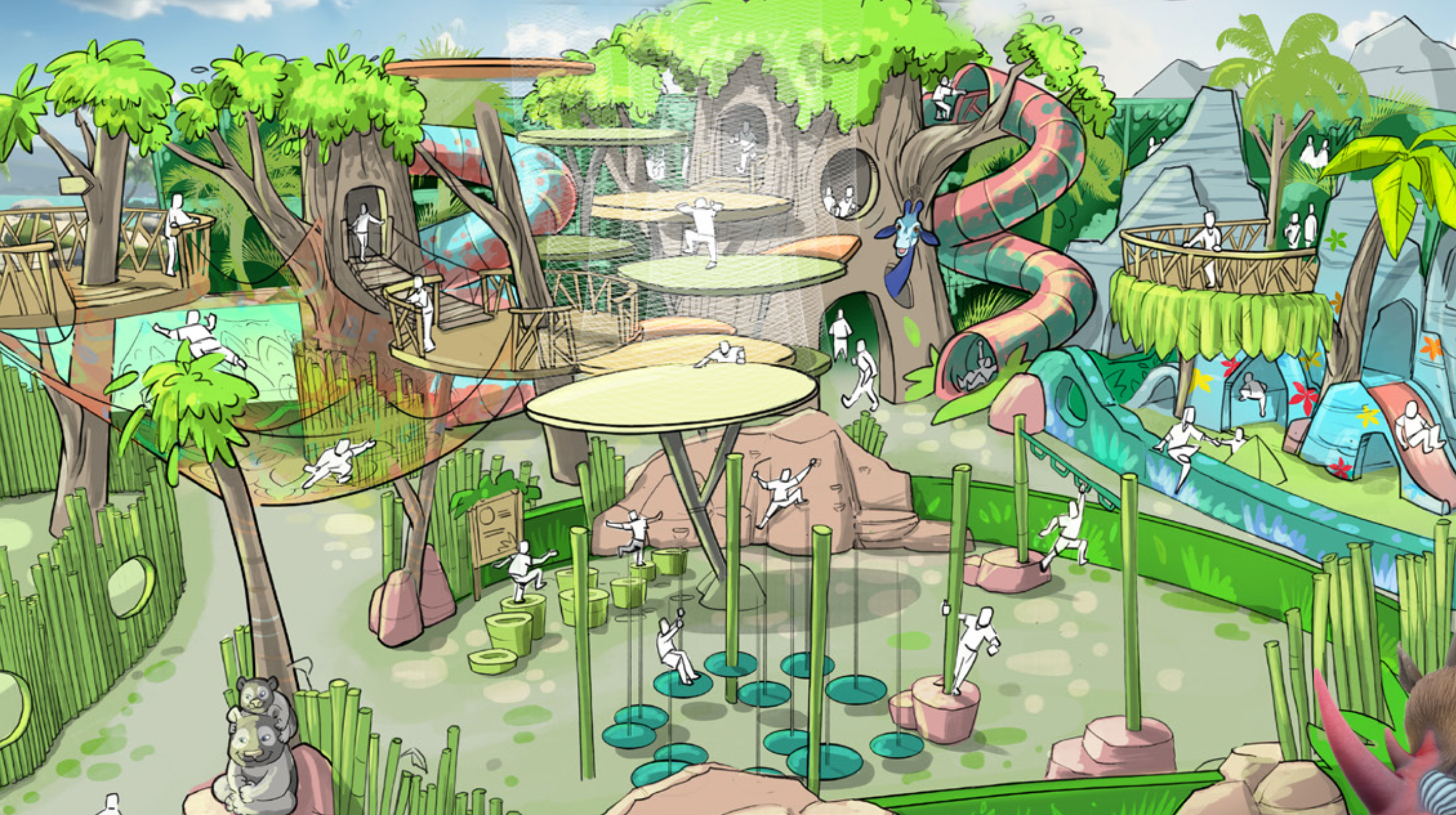 A towering jungle play structure big enough to get lost in. Themed tree canopies, suspended rope nets, giant slides, agility courses, leaf pad platforms, look-out towers and crawl tunnels — all wrapped around a centrepiece that feels like the heart of the whole jungle. 473 m² · 10 slides · 247-person capacity.