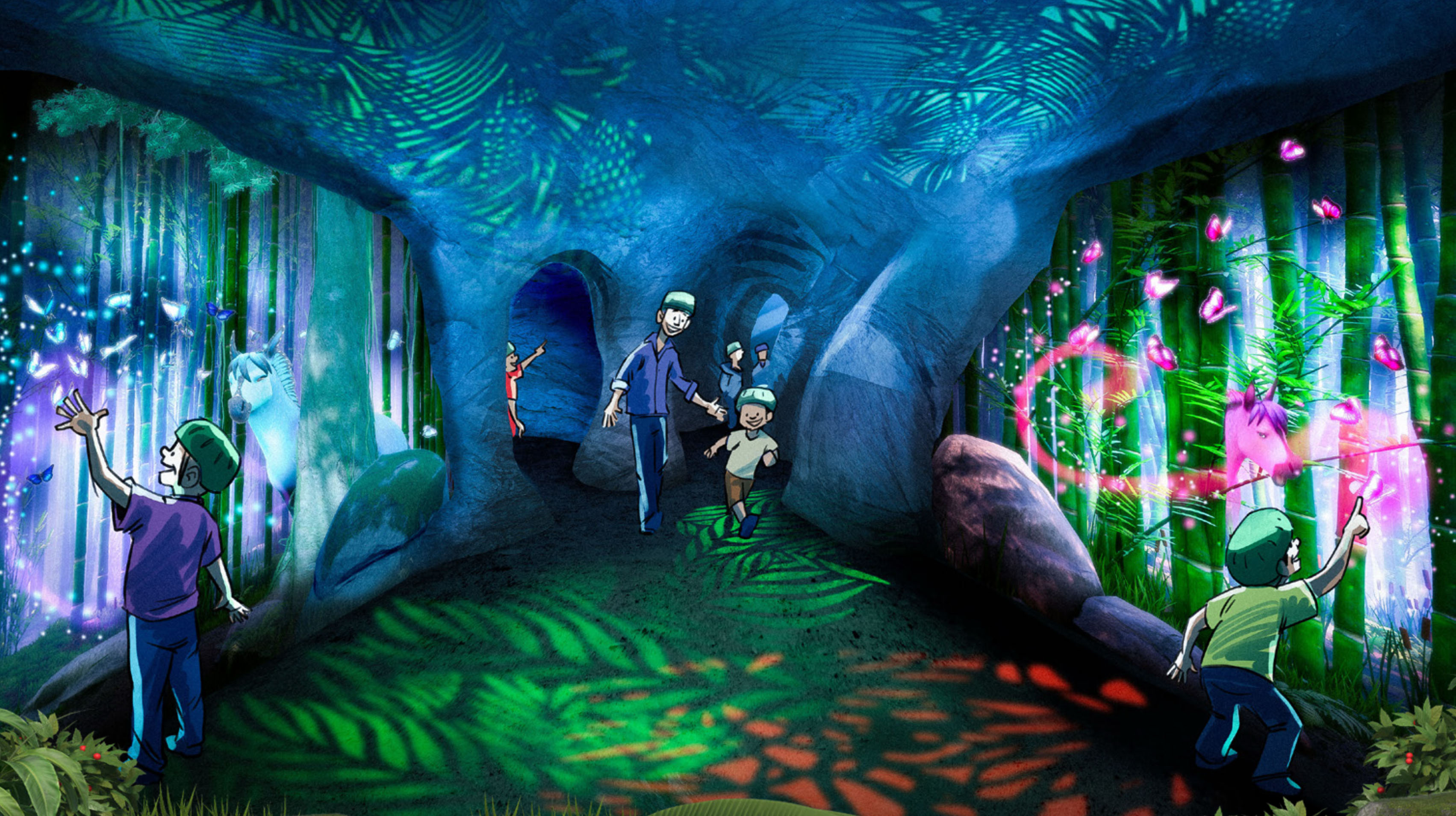 Hidden at the end of the Goo Caves, Lulu's Butterflies is the most magical room in the park. Butterflies of every colour swarm the walls and floor — move your hand slowly near one and it follows you. Gather enough of the same colour and a Butterhorse appears from the forest to greet you. A motion-tracked projected world unlike anything else.