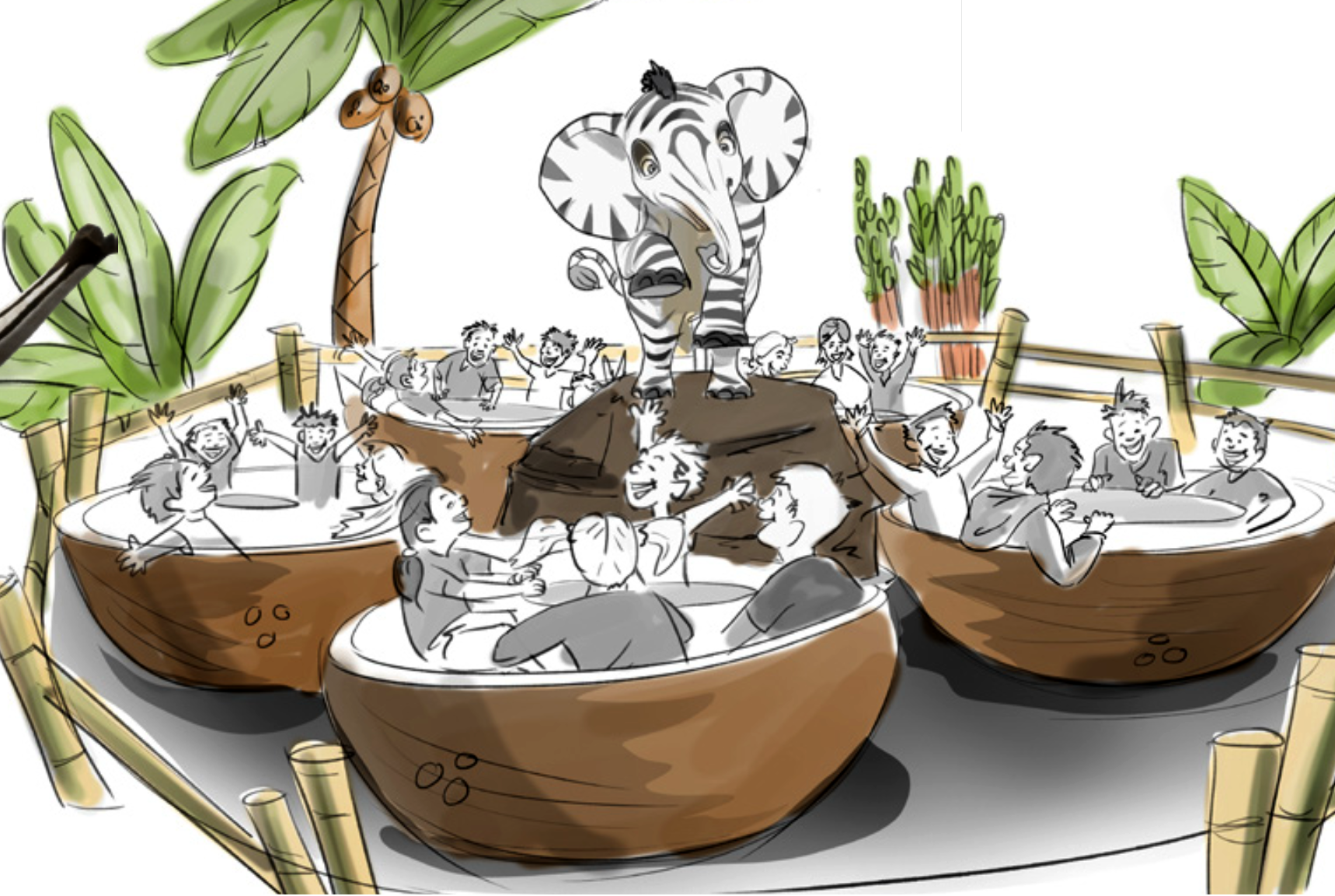 Climb into a giant coconut shell and spin until the world is a blur. Pull the wheel in the centre to make your coconut spin even faster — which means anything that happens is entirely your own fault. A massively popular classic reimagined in full ZAFARI style, with Zoomba watching from his rock looking extremely pleased with himself.