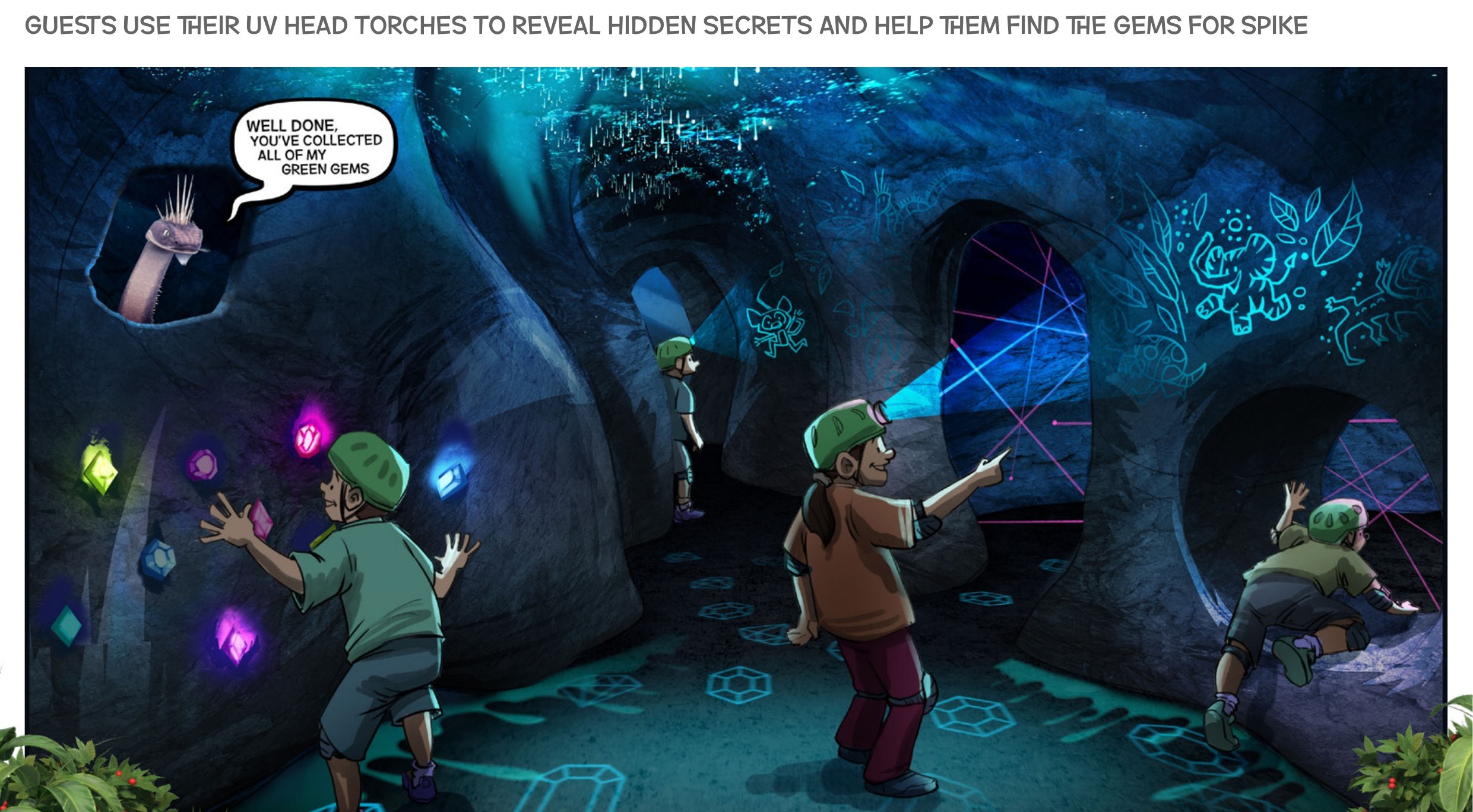 Strap on a UV head-torch and crawl, climb and wriggle through a warren of glowing caves. Spike needs your help — hidden gems are scattered everywhere, glowing under phosphorescent Goo. Collect three of the same colour and trigger a light-and-sound celebration. 85 metres of adventure: a kids' route with obstacles, and an adults' bypass for the faint-hearted.
