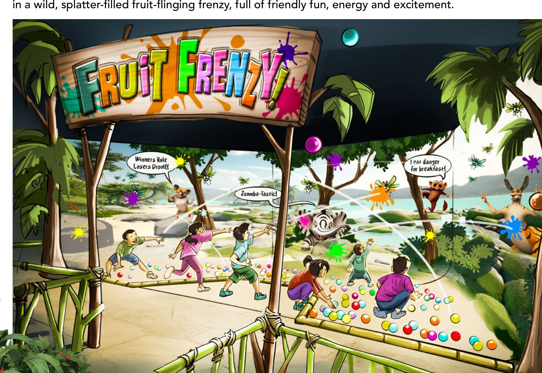 A swarm of hungry locusts is threatening the land of ZAFARI — and only you can stop them. Grab a fruit ball and fling it at the giant screen: hit the locusts, splat the targets, and try not to hit Frick, Frack, Quincy or Zoomba, who have all shown up to help and are getting in the way. Non-stop action, zero scoring — just pure fruit-flinging mayhem.
