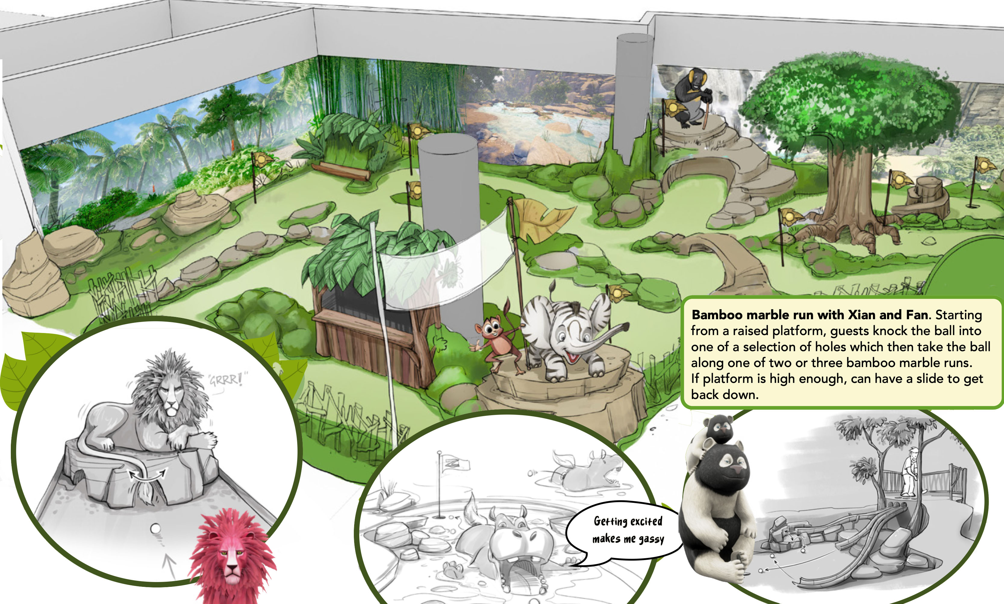 Babatua has built a very special golf course through the heart of the jungle — and of course it's completely ridiculous. Nine holes packed with wacky obstacles, trick shots, character encounters and moments of genuine unfairness. Spike's spiral, Quincy's catapult, Oscar's cauldron and a rotating hole designed to make you question all your life choices.