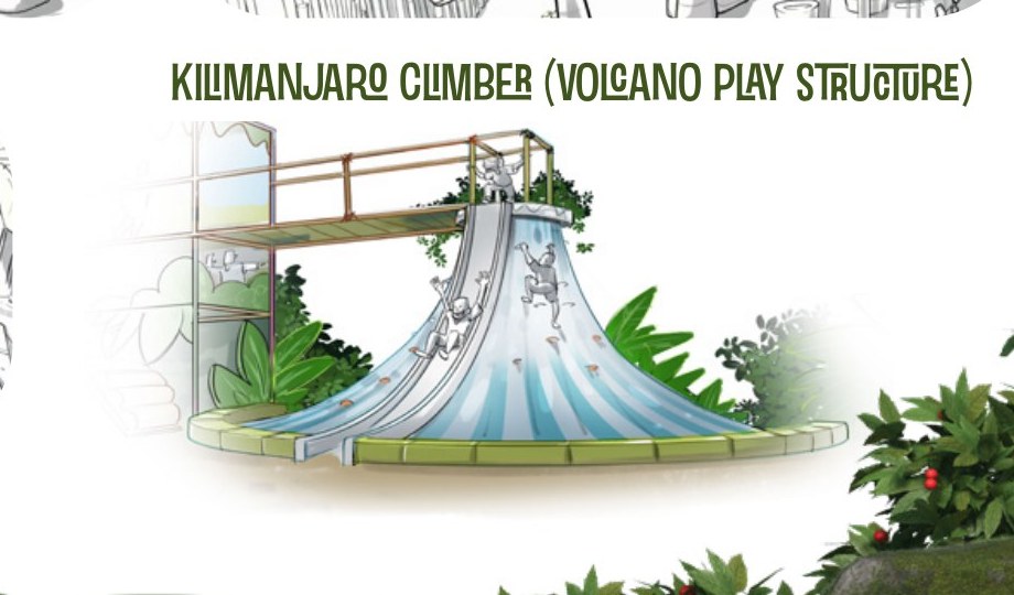 Scale the slopes of the Kilimanjaro Volcano — a dramatic climbing structure built into the play structure that gives thrill-seekers a genuine physical challenge and a spectacular view from the summit. Hand holds, foot pegs and a slide back down: where the bravest adventurers prove themselves.
