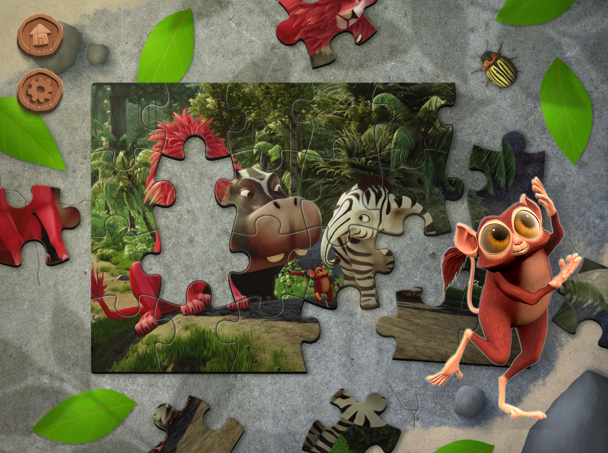 Guide Zoomba through easy jungle puzzle trails with keys, water splashes, boulders, and sticker rewards.